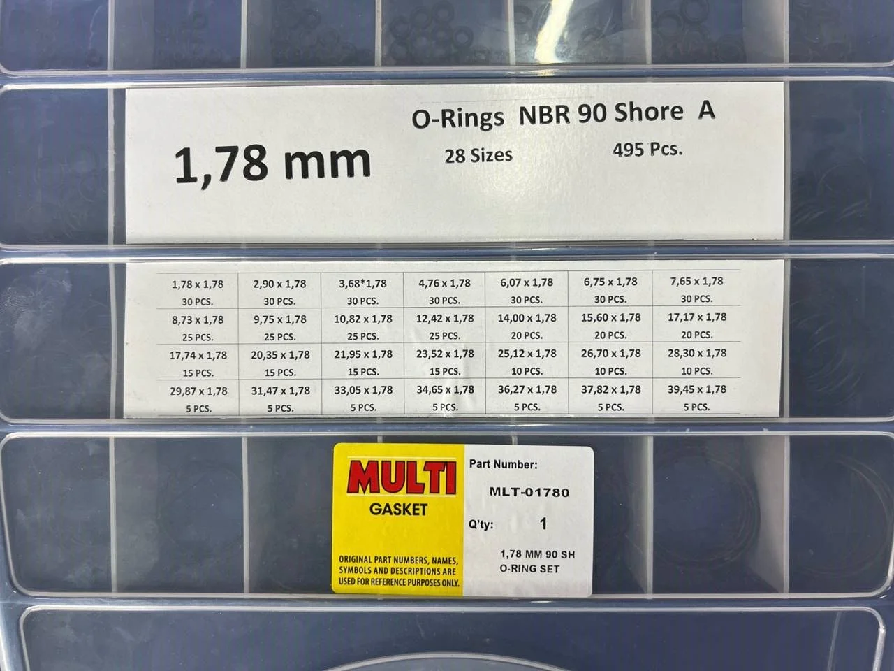 Это комплект O-колец (O-rings) из нитрилового каучука (NBR) с жесткостью 90 единиц по шору А. Комплект включает 28 различных размеров диаметров с постоянной толщиной 1,78 мм. Общее количество колец составляет 495 штук, распределенных по различным размерам. Контейнер организован для удобного хранения и быстрого доступа к каждому размеру.