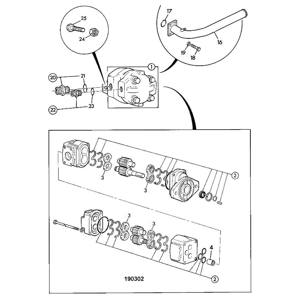 Насос имеет стандартный монтажный фланец, прямую подачу и присоединительные адаптеры (обозначены на схеме как детали 16, 20). Сердцевиной агрегата являются сборка ведущего вала, шестерни и прецизионные уплотнения (см. комплект ремкомплекта и прокладок). Применены два варианта всасывающих адаптеров для разных конфигураций машин, что делает насос максимально универсальным и ремонтопригодным в парке машин с разной историей ремонта.